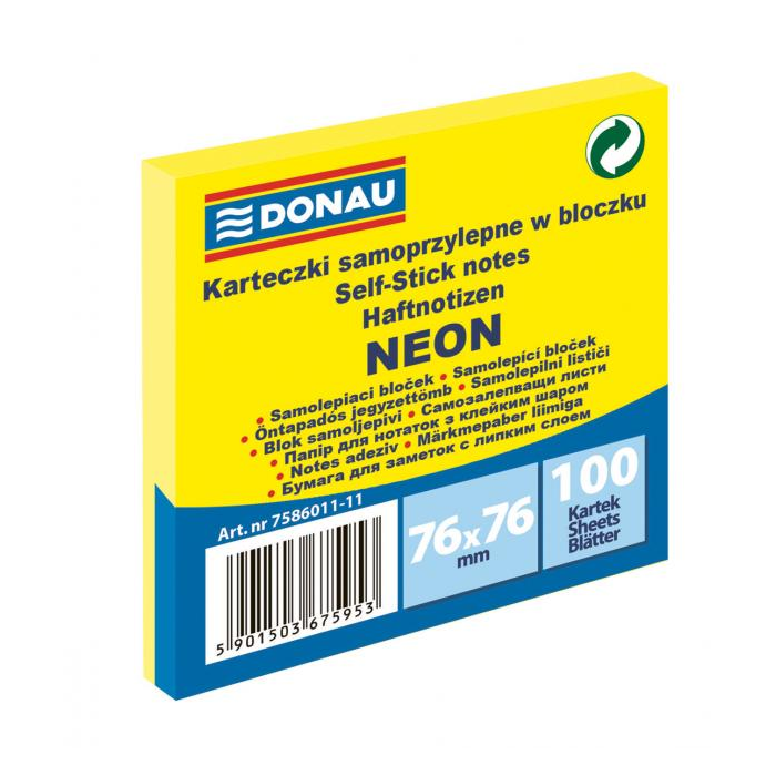 Univerzálne neónové samolepiace bločky z papiera gramáže 70 g / m², 100-lístkové, jednotlivo balené. Lepidlo zmývateľné vodou. Udelený Green Point za účasť na recyklácii a zhodnocovaní odpadov vyplývajúcich z ustanovení nariadení EÚ. Väčšie balenie 12 ks. Farba žltá.