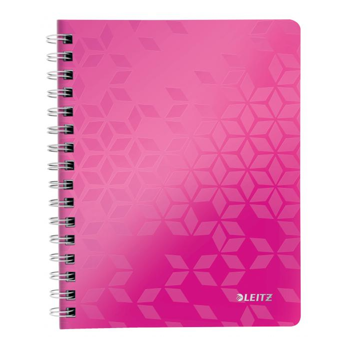 Krúžkový blok z dizajnovej rady Leitz WOW formátu A5 v žiarivých farbách. Vo vnútri biely papier s hmotnosťou 80 g / m2 s FSC® certifikáciou. Stránky sú perforované pre ľahšie odtrhávanie jednotlivých listov. Dvojitá drôtená krúžková väzba uľahčuje pretáčanie listov a zaisťuje dlhú životnosť bloku. Blok s pružnými doskami z polypropylénu obsahuje odnímateľné pravítko a vnútorné vrecko na uloženie voľných papierov, Väčšie balenie 6 ks. Farba metalická ružová.