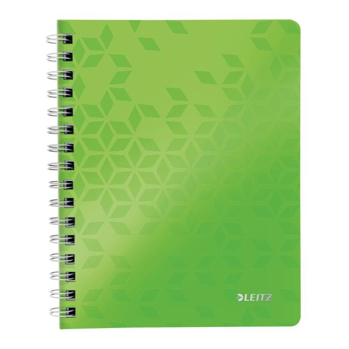 Krúžkový blok z dizajnovej rady Leitz WOW formátu A5 v žiarivých farbách. Vo vnútri biely papier s hmotnosťou 80 g / m2 s FSC® certifikáciou. Stránky sú perforované pre ľahšie odtrhávanie jednotlivých listov. Dvojitá drôtená krúžková väzba uľahčuje pretáčanie listov a zaisťuje dlhú životnosť bloku. Blok s pružnými doskami z polypropylénu obsahuje odnímateľné pravítko a vnútorné vrecko na uloženie voľných papierov, Väčšie balenie 6 ks. Farba metalická zelená.
