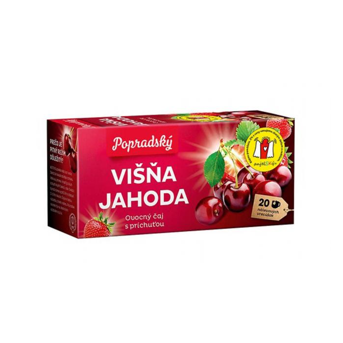 Aromatizovaný ovocný čaj s príchuťou Višňa a Jahoda. Porciovaný v nálevových vreckách.