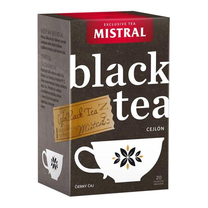 Mistral - Čierny čaj Cejlón, porciovaný v nálevových vreckách. Balenie 20 × 1,5 g, hmotnosť 30 g.