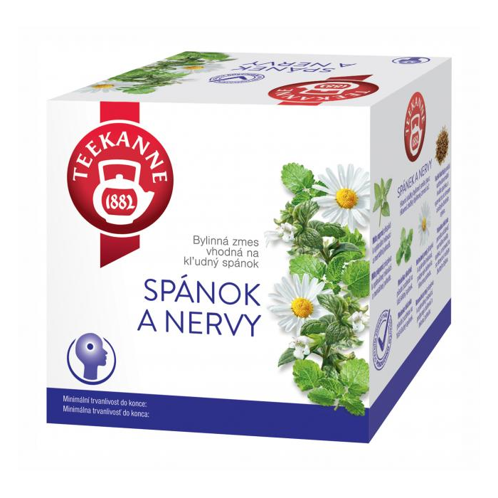 Liečivý bylinný čaj Teekanne na spánok a nervy. Balenie 10 x 2 g. Hlavné zložky bylinného čaju sú: Mäta pieporná prispieva k optimálnej relaxácii a mentálnej pohode. Medovka pôsobí pozitívne na Váš kľudný spánok. Harmanček prispieva k optimálnej relaxácii, podporuje duševnú a telesnú pohodu. Valeriána lekárska pomáha udržiavať normálnu kvalitu spánku, a vyrovnať sa so stresom a rušným životným štýlom.