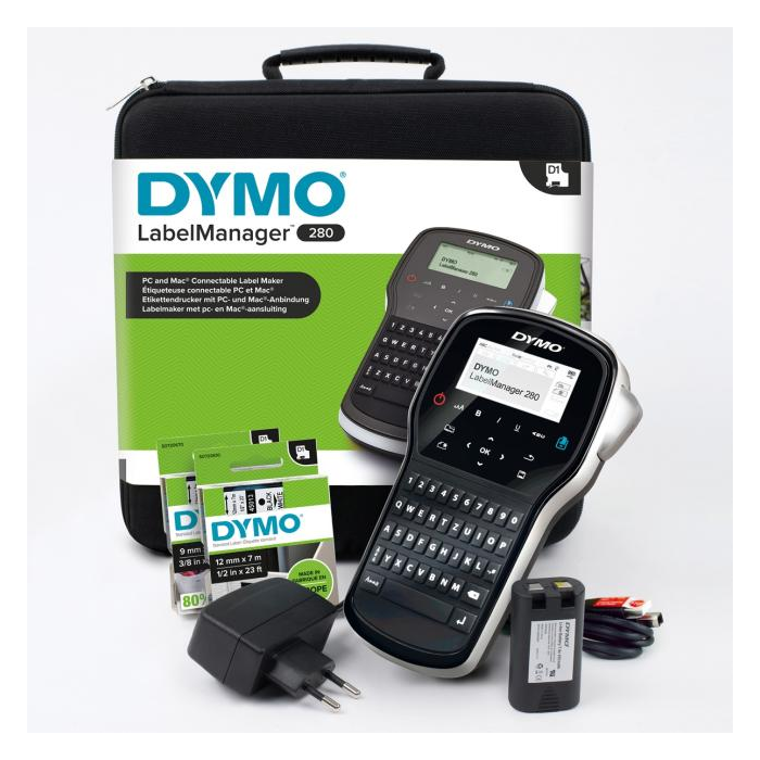 funkcia automatického vypínania. Technické parametre: 2-riadkový 13-znakový semi-grafický displej, slovenská diakritika, QWERTY klávesnica, 222 symbolov a obrázkov, 8 druhov rámčekov, 3 fonty, 7 štýlov písma,6 veľkostí písma, funkcia uloženia textu, pamäť na uloženie posledných 9 štítkov, ručný odstrih pásky, USB pripojenie. Balenie obsahuje: štítkovač LabelManager 280, Nabíjateľná batéria, USB kábel, Štartovacia kazeta na štítky D1, čierna na bielej, 12 mm x 3 m, Karta rýchleho spustenia, Nabíjací adaptér.