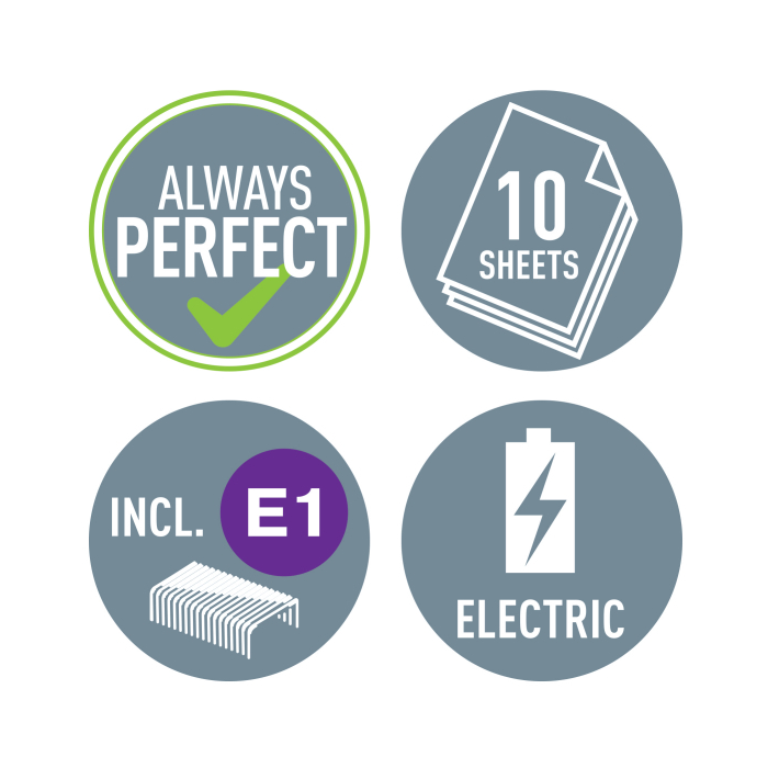 Technológia s napájaním na batérie na zošívanie v pohybe. V žiarivých farbách WOW. Batérie (4× 1,5 V AAA LR03) nie sú súčasťou balenia. Kapacita 10 listov. Náhradné spinky ES556800. Farba modrá.