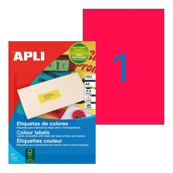 Fluorescenčné farebné etikety s ostrými rohmi nielen pre zábavu a originalitu.Vhodné do atramentových a laserových tlačiarní a kopíriek. Rozmery: 210x297 mm Farba: neón.červená Balenie: 100 hárkov