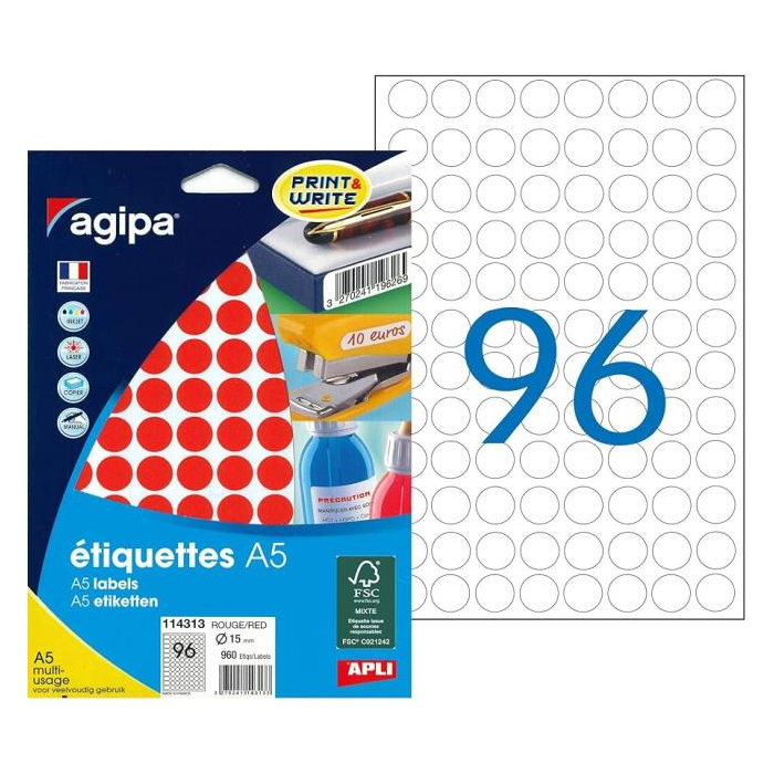 Etikety kruhové 15mm Agipa A5 červené