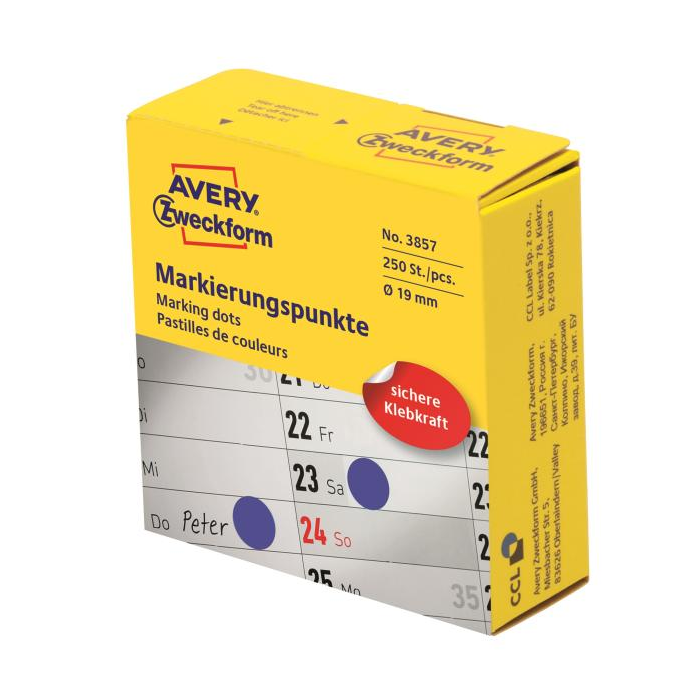 Praktické balenie kruhových etikiet na role s jednoduchým a rýchlym samoobslužným prístupom k etiketám. Balenie krabička. Farba modrá.