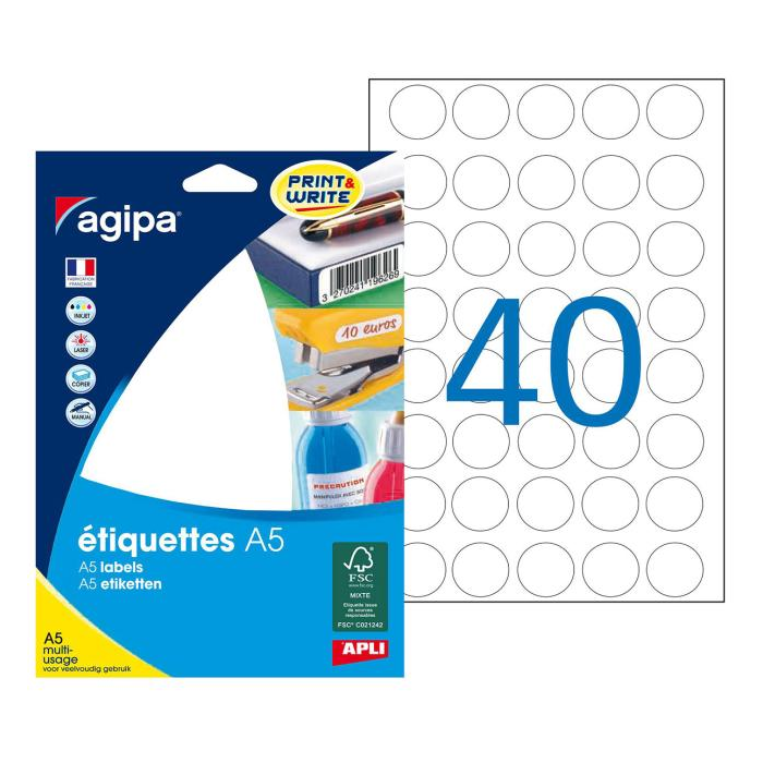 Biele kruhové etikety na formáte A5, na viacúčelovú tlač aj ručný popis.