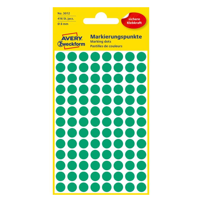 Kruhové etikety na ručný popis. Priemer 8 mm. Farba zelená. Etikety v balení : 416 kusov.