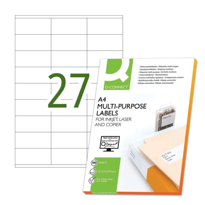 Univerzálne samolepiace etikety pre laserové a atramentové tlačiarne a kopírovacie zariadenia. Formát A4. Farba biela. Balenie 100 hárkov. Etikety na hárku 27 ks.