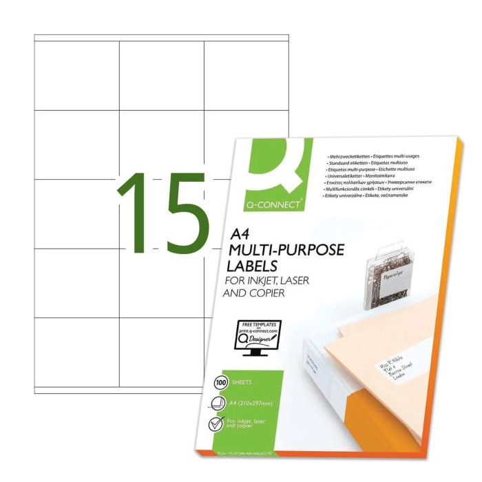 Univerzálne samolepiace etikety pre laserové a atramentové tlačiarne a kopírovacie zariadenia. Formát A4. Farba biela. Balenie 100 hárkov. Etikiet na hárku 15 ks.