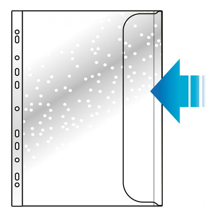 Priehľadné matné obaly s eurodierovaním a chlopňou. Šírka obalu aj s dierováním je 23,5 cm. Formát A4. Balené v sáčku.