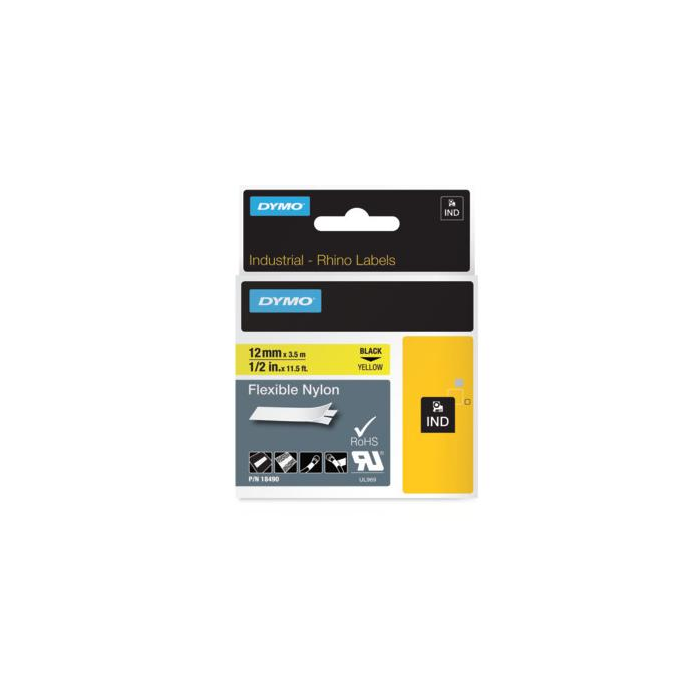 Pásky z flexibilného nylonu sú určené do etiketovacích zariadení DYMO radu Rhino a LM s aplikáciou v uzavretých priestoroch. Sú špeciálne vyvinuté na označovanie vodičov, káblov a strojov na zakrivené a rovné povrchy. Odolávajú rozdielom teplôt a ultrafialovému žiareniu. Dĺžka pásky 3,5 m. Farba pásky žltá, čierne písmo. Šírka pásky 12 mm.