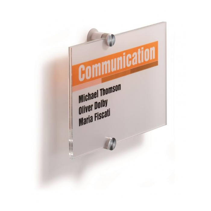 Tabuľka na dvere z novej rady v elegantnom, atraktívnom, a zároveň jednoduchom dizajne. Dodávaná s 2 polopriehľadnými vnútornými listami, vhodnými na farebnú alebo čiernu potlač. Listy sa vložia medzi akrylové panely tabuľky a tabuľka sa prichytí k stene alebo dverám 2 veľkými hliníkovými skrutkami. Ľahká montáž, názorný návod je priložený.