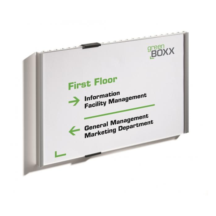 Informačná tabuľka na dvere. Štylizovaná tabuľka vo vrúbkovanej úprave, spodná časť z vysoko kvalitného hliníka, fixujúce spojky v čiernej farbe. K podkladu môže byť zadnou časťou priskrutkovaná alebo nalepená. Text je chránený neoslňujúcim akrylátovým krytom, ktorý pridržiavajú dve fixujúce spojky. Súčasťou balenia je montážna sada s názorným návodom a čistým listom papiera vo veľkosti tabuľky.