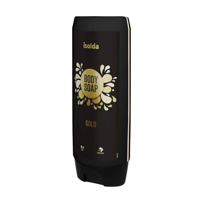 ISOLDA Gold body soap je vhodný na umývanie celého tela i rúk. Do sprchového kúta, alebo k umývadlu ho môžete umiestniť pomocou odolného nerezového držiaka pre tekuté mydlá a lotiony, alebo držiaka CLICK&GO!