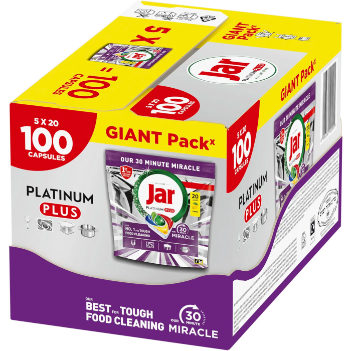 Tablety do umývačky riadu JAR Platinum Plus 30 Minute Miracle 100 ks Číslo 1 na umývanie zaschnutých zvyškov jedla Zázračné riešenie všetko v jednom pre dokonale čistý riad bez námahy. Kapsule do umývačky riadu Jar 30 Minute Miracle Platinum Plus sú navrhnuté na rýchle a maximálne účinné umývanie aj silne znečisteného riadu. Vďaka pokročilej technológii a päťkomorovej kapsuli si poradia so zaschnutými zvyškami jedla už za 30 minút, bez nutnosti predumývania alebo opakovaného umývania. Ideálna voľba pre rušné domácnosti, ktoré chcú perfektný výsledok hneď po prvýkrát.