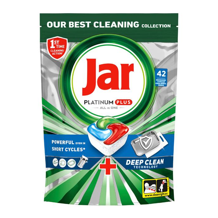 Kapsule do automatickej umývačky riadu Jar Platinum Plus All in One zanechávajú riad čistý ako nový a majú najlepšie čistiace účinky z kolekcie Jar na odolné zvyšky jedla. Jar Platinum Plus poskytuje vynikajúcu čistotu a odstraňuje odolné škvrny od jedla aj v podmienkach krátkeho cyklu. Pokiaľ teda máte málo času, nič sa nedeje. Prepnite na krátky režim. Jar v sebe zlučuje tekutý aj práškový čistiaci prostriedok v jednej účinnej kapsule. Vysoko rozpustný obal sa rýchlo rozpúšťa a funguje dobre aj pri krátkych cykloch, pretože riad sa začína ihneď umývať. A navyše sa kapsule tak ľahko používajú! Kapsulu nie je potrebné rozbaľovať a stačí ju len vložiť do priehradky umývačky na umývací prostriedok. Prepnite na krátky cyklus a ušetrite oproti bežnému štandardnému cyklu čas, energiu a vodu!