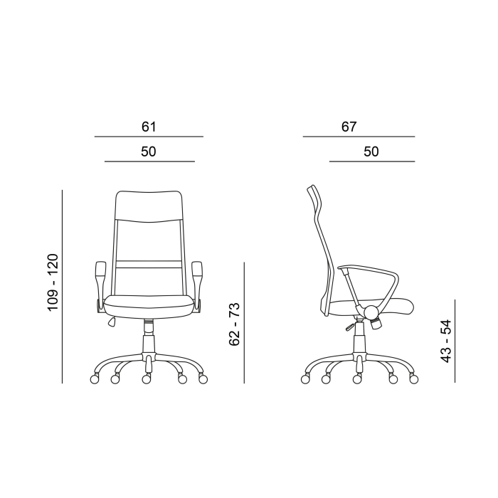 • celková výška 109-120 cm, šírka 61 cm, hĺbka sedáku 50 cm, výška sedáku 43-54 cm