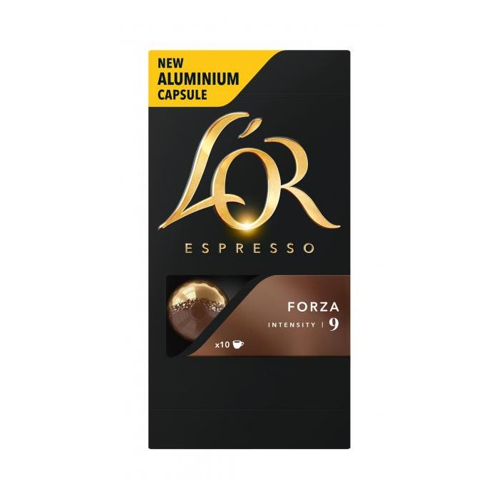 L'OR Espresso Forza Intenzita 9. Objavte ohnivé espresso v ktorom sa snúbi nespútaná sila vysoko kvalitnej tmavo praženej kávy s intenzívnou plnou chuťou. Bohaté a plné espresso Vás poteší lahodnou a krémovou vrstvou peny s odtieňmi jantáru. Espresso je obľúbené pre svoju jemnosť a intenzitu. L'OR Espresso uchováva jedinečnosť kávy v hliníkovej kapsuli špeciálne zabalené tak, aby sa aróma uvoľnila až počas prípravy kávy. Chuť: intenzívna-silná-ohnivá. Intenzita-9/14. Tieto kapsule sú vhodné do kávovaru Nespresso. Balenie obsahuje 10 kapsúl 52 g.