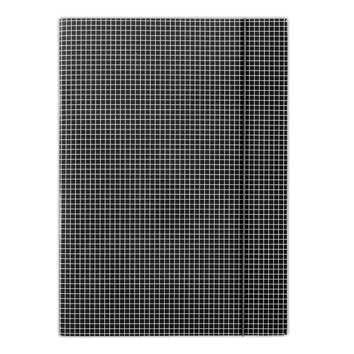 Kartonový obal vyrobený z lepenky s hmotnosťou 400g. Jednostranne potiahnutý vysoko lesklým tlačovým lakom, okrúhla vertikálna guma vo farbe obalu chráni obsah pred vykĺznutím. Károvaná potač. Formát: A4. Farba čierna. Rozmery 232 x 317 mm.