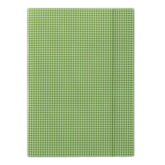 Kartonový obal vyrobený z lepenky s hmotnosťou 400g. Jednostranne potiahnutý vysoko lesklým tlačovým lakom, okrúhla vertikálna guma vo farbe obalu chráni obsah pred vykĺznutím. Károvaná potač. Formát: A4. Farba zelená. Rozmery 232 x 317 mm.