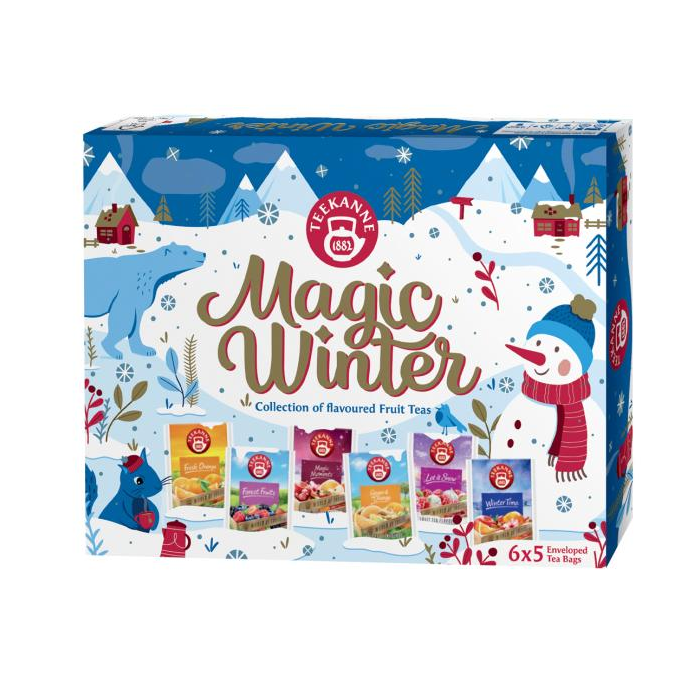 Hmotnosť: 68,75 g. V balení 6 x 5 nálevových vrecúšok: Fresh Orange 5 x 2,25 g, Ginger Lemon 5 x 1,75 g, Magic Apple - 5 x 2,25 g, Magic Moments 5 x 2,25 g, Sweet Cherry 5 x 2,5 g, Winter Time 5 x 2,5 g.