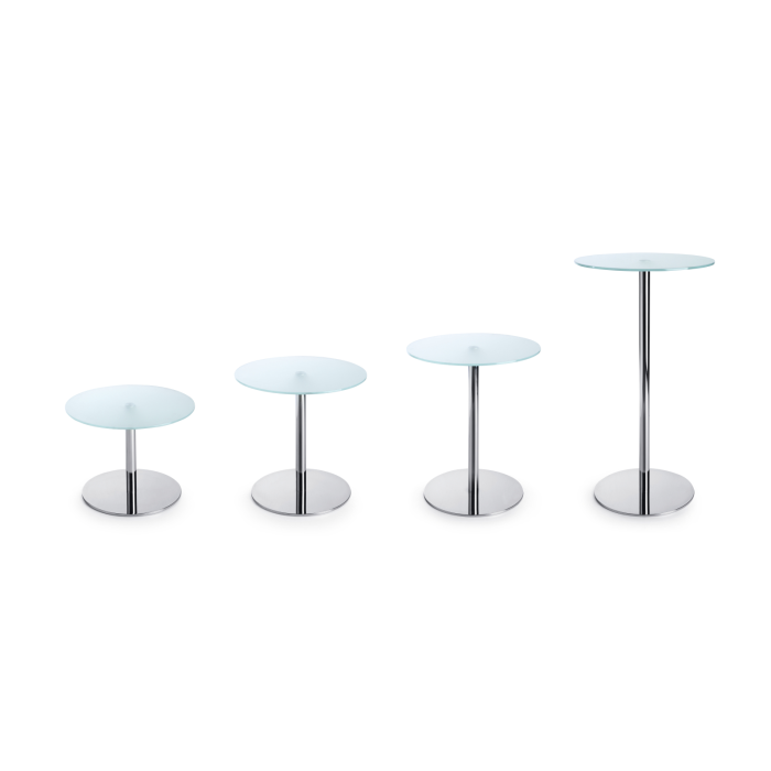 Minimalistický stolík SR 40 je navrhnutý s okrúhlou doskou, vyrobenou z tvrdeného mliečneho skla s hrúbkou 10 mm.