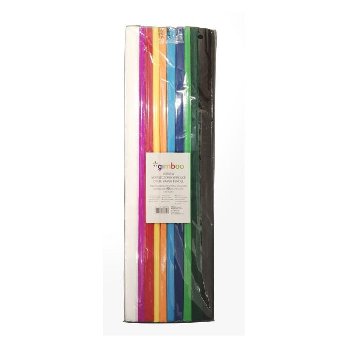 Krepový papier Gimboo v rolke rozmerov 50 x 200 cm. Balené v sáčku po 10 ks pastelových alebo klasických farieb.