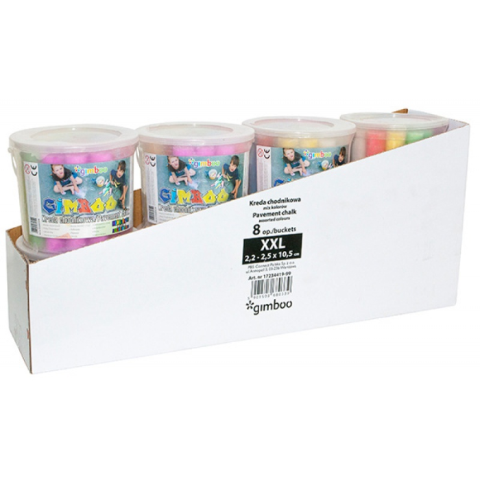 V malom plastovom vedre s rúčkou. Na kreslenie vonku na ihriskách. Kužeľovitý tvar s mierne zaobleným jedným hrotom. Dĺžka: približne 105 mm, priemer: približne 25 mm. Neodporúča sa deťom do 3 rokov. 20 kusov v predajnej jednotke. Farba: rôzne farby.
