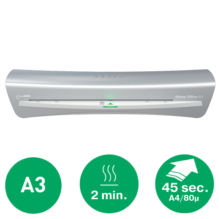 Štýlový a kompaktný laminovací prístroj Leitz iLAM Home Office spája moderný dizajn s funkčnosťou. Tento pre obsluhu prívetivý laminátor vo formáte A3 ponúka rýchle 2-minútové zahriatie a dokument A4 v 80-mikrónovej kapse na laminovanie zalaminuje už za obyčajných 45 sekúnd. Kolískový prepínač umožňuje výber z troch úrovní hrúbky kapsy na všestranné použitie a splnenie všetkých požiadaviek na laminovanie. Hladkú prevádzku zabezpečuje mechanizmus proti zaseknutiu kapsy tak, že bez námahy odstráni akékoľvek zaseknuté alebo zle vložené vrecká na laminovanie. Inovatívna inteligentná stavová LED dióda uľahčuje používanie pomocou intuitívnych svetiel a zvukov: červená dióda znamená zahrievanie, zelená so zvukovým upozornením oznamuje pripravenosť na laminovanie, blikajúca červená dióda znamená automatické vypnutie po 15 minútach nečinnosti. Chráňte svoje dokumenty rýchlo, efektívne a štýlovo. Určené na kapsy od 75 do 125 mikrónov. TUV/GS, CE certifikácia. Strieborná a biela farba.