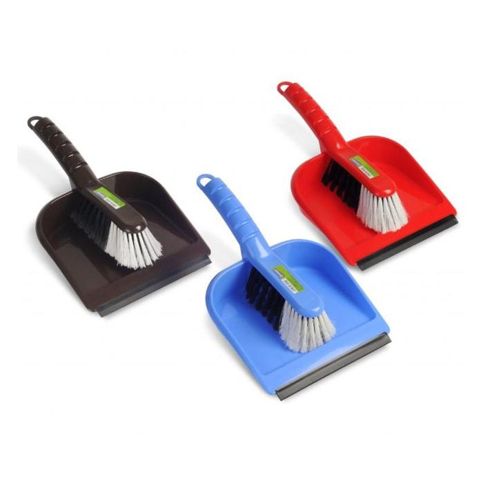 Súprava - metlička so syntetickými štetinami a lopatka s gumovou lištou. Mix farieb - hnedý, modrý a červený.