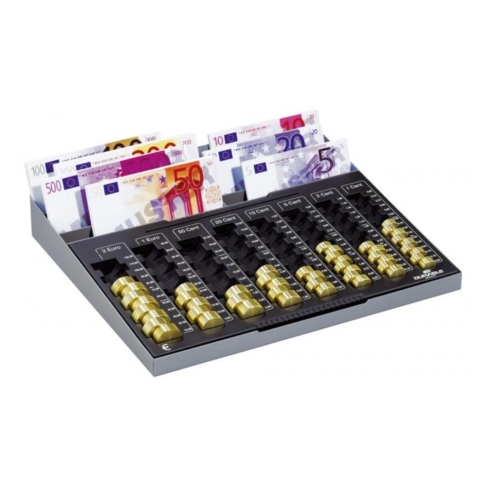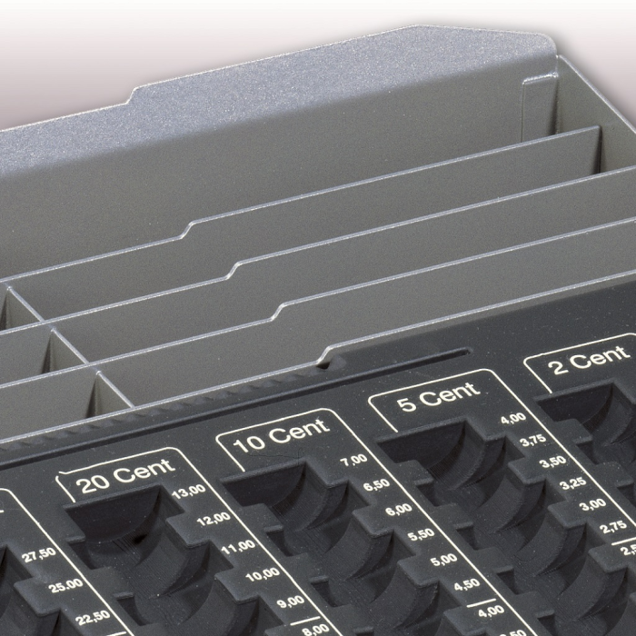 Samostatná mincová priehradka v oceľovom ráme. Rozmerovo vhodná do bežnej stolovej zásuvky. Obsahuje osem oddielov na eurá a centy v maximálnej hodnote 233,90 Euro. Priehradka na bankovky, poukážky alebo stravné lístky vo vrchnej časti.
