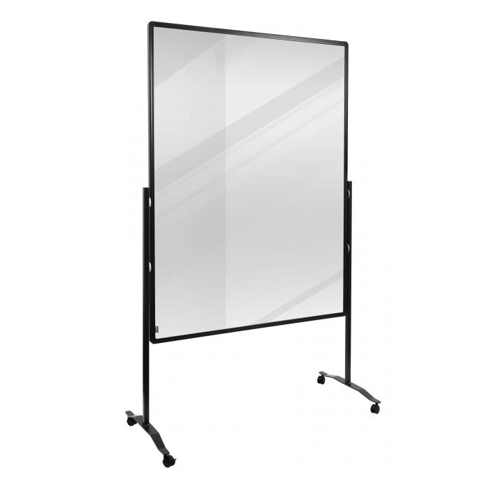 Predeľovacia tabuľa s priehľadným povrchom z plexiskla hrúbky 4 mm, popisovateľná popisovačmi na biele tabule. Nohy so štyrmi uzamykateľnými kolieskami. Hliníkový rám, nohy a pätky s čiernymi plastovými koncovkami. Ľahko oddelí stoly a vytvorí tak bezpečné a hygienické pracovné prostredie. Rozmery 150 × 120 cm.