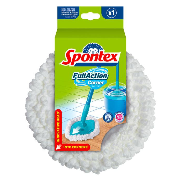 Full Action Corner System strapcová náhrada zo 100% mikrovlákna v tvare citrónu, ktorý umožňuje ľahké upratovanie rohov. Náhrada sa ľahko upevňuje pomocou suchého zipsu. Je účinná iba s vodou, odstráni 99% baktérií aj bez použitia detergentov. Vhodná pre všetky typy podláh.
