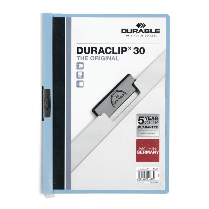 Obal vyvinutý spoločnosťou DURABLE pre viazanie nedierovaných listov. Materiál z PVC s unikátnym kovovým klipom, ktorý sa prispôsobí vloženému počtu listov a priehľadnou prednou stranou. Ideálny na prezentácie, ponuky, správy, poznámky na konferencie, semináre a pod. Formát A4. Kapacita 1-30 listov. Väčšie balenie 25 ks.