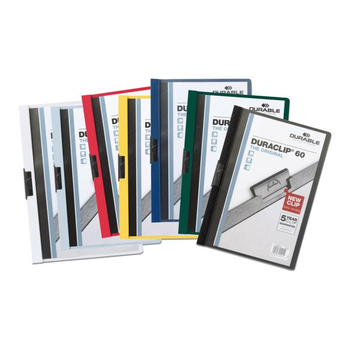 Obal vyvinutý spoločnosťou DURABLE pre viazanie nedierovaných listov. Materiál z PVC s unikátnym kovovým klipom, ktorý sa prispôsobí vloženému počtu listov a priehľadnou prednou stranou. Ideálny na prezentácie, ponuky, správy, poznámky na konferencie, semináre a pod. Formát A4. Kapacita 1-60 listov. Väčšie balenie 25 ks.