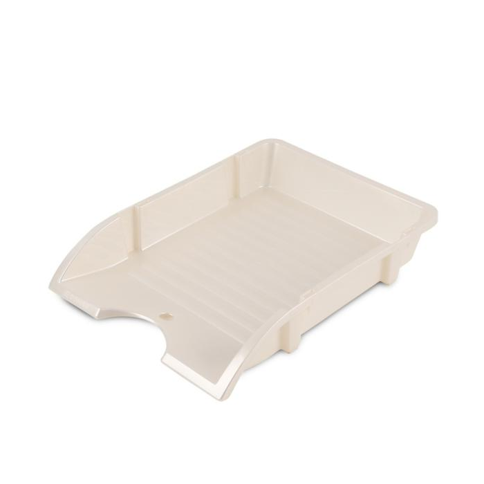 odkladač na stôl s novým originálnym štýlom vyrobené z nerozbitného a deformačne odolného polypropylénu rebrovaný povrch na dne odkladača možnosť vertikálneho spojenia odkladačov a ich umiestnenia na seba pre zníženie objemu počas prepravy otvor v základni a výrezy po stranách pre jednoduché použitie formát: A4 rozmery: 250x345x45mm farba: perleťová