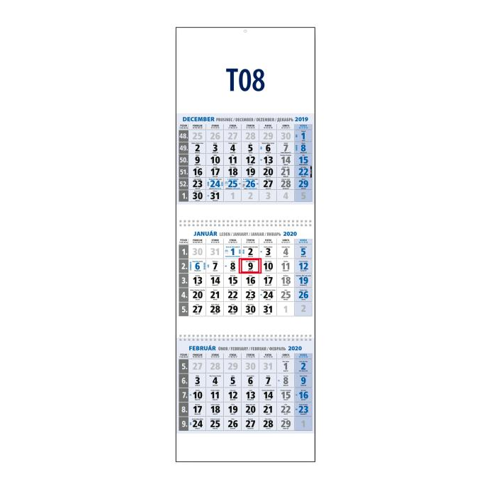 Trojdielny kalendár s menami v SK + CZ, názvy mesiacov a dní v SK, CZ, EN, DE a RU.