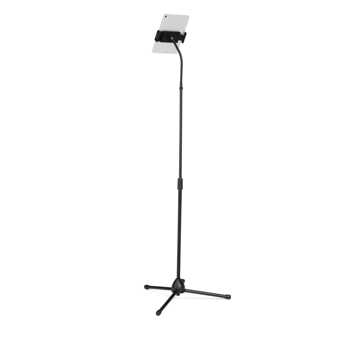 Podlahový stojan s držiakom na tablet a mobilný telefón, vybavený flexibilným ramenom a guľovým kĺbom