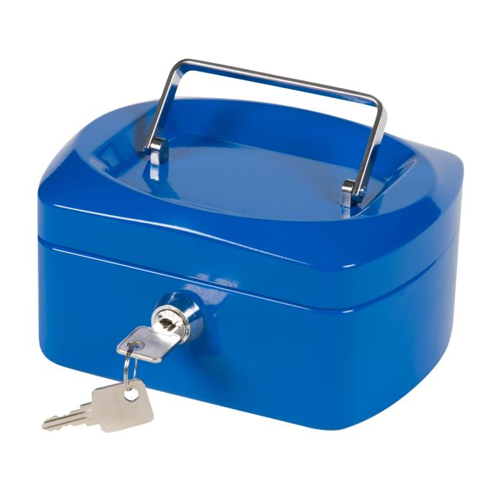 Uzamykateľná pokladnička s tvarovaným úchytom, plastovou priehradkou na mince a 2 kľúčami. Materiál pevná oceľ. Rozmery 155 × 75 × 120 mm. Farba modrá.
