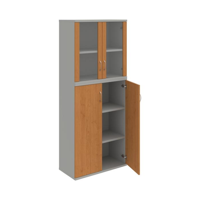 Kombinovaná skriňa - dvere/nika. Kancelárske skrine STRONG majú robustnú konštrukciu a vyššiu nosnosť políc ako bežné kancelárske skrine.V ponuke sú skriňové moduly s výškou 185 cm, 111 cm alebo 74 cm a šírky 80 cm alebo 40 cm. Hĺbka všetkých modelov skriňového radu STRONG je 40 cm.Chrbát, vyrobený z 8 mm hrubých dosák, je obojstranne pohľadový, takže skrine môžete použiť ako priestorový deliaci prvok. Hrúbka samotných políc je 25 mm, čo znamená nosnosť 80 kg na 1 policu.Korpusy, dvierka a police skríň sú olepené odolnou 2mm ABS hranou, ktorá garantuje dostatočnú ochranu proti poškodeniu.