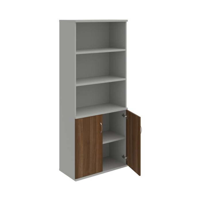 Kombinovaná skriňa - dvere/nika. Kancelárske skrine STRONG majú robustnú konštrukciu a vyššiu nosnosť políc ako bežné kancelárske skrine.V ponuke sú skriňové moduly s výškou 185 cm, 111 cm alebo 74 cm a šírky 80 cm alebo 40 cm.Hĺbka všetkých modelov skriňového radu STRONG je 40 cm.Chrbát, vyrobený z 8 mm hrubých dosák, je obojstranne pohľadový, takže skrine môžete použiť ako priestorový deliaci prvok. Hrúbka samotných políc je 25 mm, čo znamená nosnosť 80 kg na 1 policu.Korpusy, dvierka a police skríň sú olepené odolnou 2mm ABS hranou, ktorá garantuje dostatočnú ochranu proti poškodeniu.
