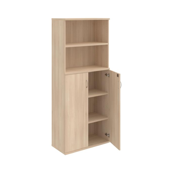 Kombinovaná skriňa - dvere/nika. Kancelárske skrine STRONG majú robustnú konštrukciu a vyššiu nosnosť políc ako bežné kancelárske skrine.V ponuke sú skriňové moduly s výškou 185 cm, 111 cm alebo 74 cm a šírky 80 cm alebo 40 cm.Hĺbka všetkých modelov skriňového radu STRONG je 40 cm.Chrbát, vyrobený z 8 mm hrubých dosák, je obojstranne pohľadový, takže skrine môžete použiť ako priestorový deliaci prvok. Hrúbka samotných políc je 25 mm, čo znamená nosnosť 80 kg na 1 policu.Korpusy, dvierka a police skríň sú olepené odolnou 2mm ABS hranou, ktorá garantuje dostatočnú ochranu proti poškodeniu.