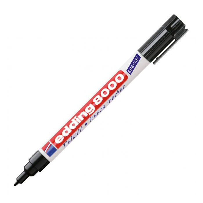 Popisovač edding 8000 freeze s permanentným rýchloschnúcim atramentom, odolným voči mrazu. Maximálne vhodný na označovanie a popisovanie obalov a dóz do zmrazeného prostredia. Hrot okrúhly, šírka stopy 1 mm.