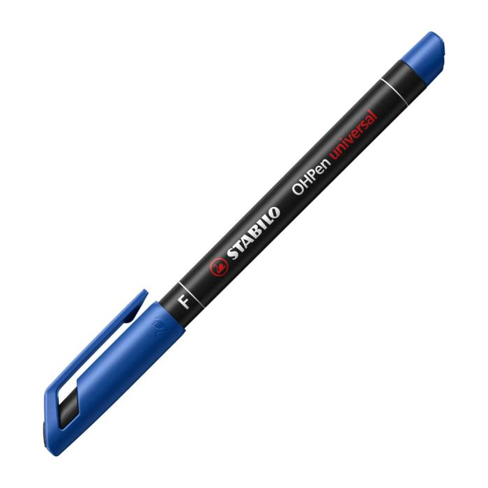 Permanentné popisovače na popisovanie takmer všetkých hladkých povrchov. Nekĺzavá úchytová zóna, praktický klip, bez vrchnáka vydrží až 3 dni. Väčšie balenie 10 ks v jednej farbe. STABILO® OHPen universal Fine (F). Hrot okrúhly, šírka stopy 0,7 mm. Farba modrá.
