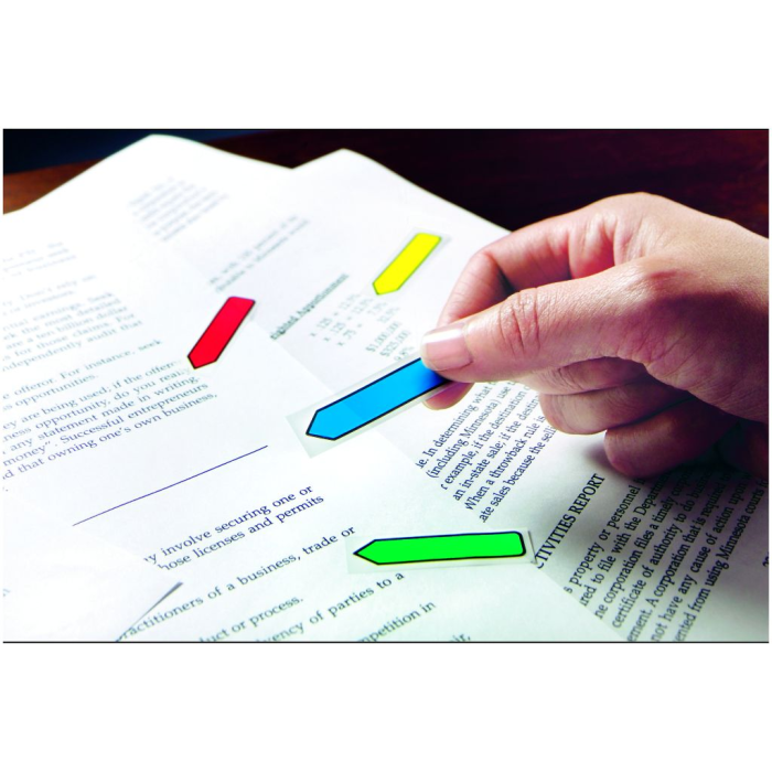 Úzke acetátové záložky do kníh, časopisov, ako register do cenníkov, kartoték, katalógov, zakladačov, archívov a pod. Priehľadná lepiaca čast a farebná časť na označenie.Prelepiteľné, znovunalepiteľné a popisovateľné. Rozmery záložky 12,5x43 mm.Dodávané v kombinácii 4 základných (červená,zelená, modrá, žltá) alebo 4 neónových farieb (žltá, fialová, ružová, modrá) po 24 lístkov.Záložky s potlačou šípky upozorňujú na konkrétnu informáciu v texte. Šírka indexu 12,5 mm, v balení 4 farby po 24 lístkov.