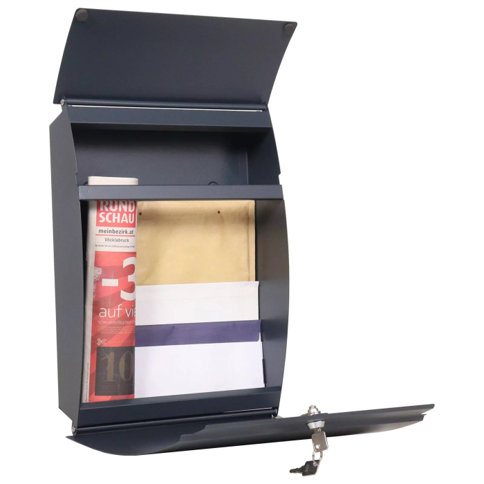Antracitová poštová schránka z modelovej rady Harrow ponúka čisté línie a naozaj moderný vzhľad. Oblá predná čast v sebe ukrývy predný vhod a aj dvierka pre výber pošty. Prístup k doručenej pošte je naozaj jednoduchý. Pred neželaním vniknutím do schránky chráni klasický cylindrický zámok. Schránka nemá menovku, aby jej čisté línie ostali zachované a neporučené. Na zadnej strane sú pripravené otvory na upevnenie. Materiál na upevnenie je súčasťou dodávky.