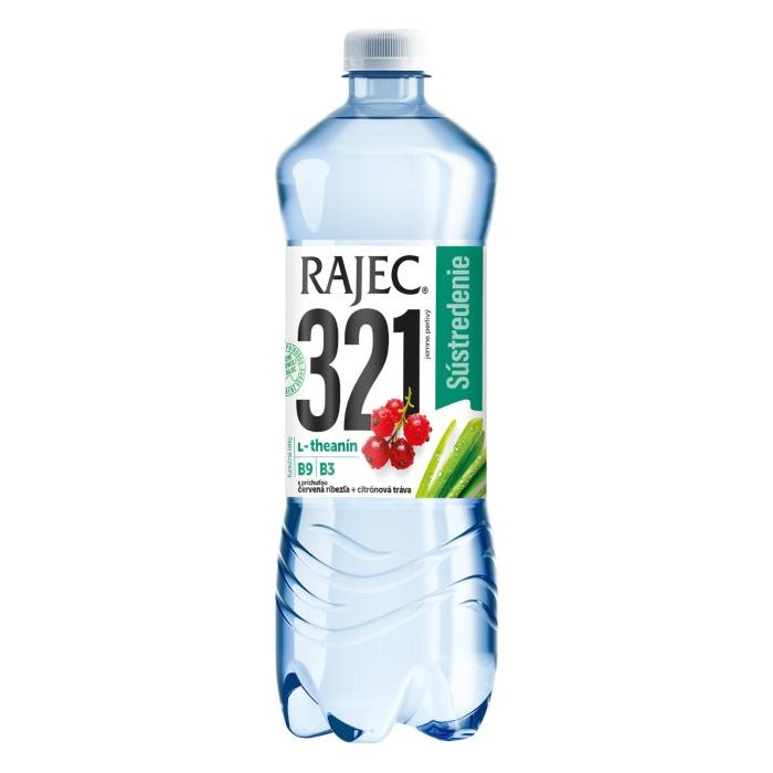 Výživový doplnok. Nealkoholický nápoj z pramenitej vody Rajec s príchuťou červených ríbezlí a citrónovej trávy s vitamínmi a L-theanínom, jemne sýtený.