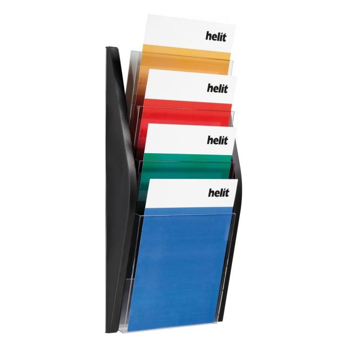 Nástenný stojan na prezentáciu materiálov. Štyri priehľadné priehradky slúžia na umiestnenie materiálov formátu A4. Materiál kvalitný plast.Rozmery (š x v x h) 275 x 540 x 80 mm. Farba čierna.